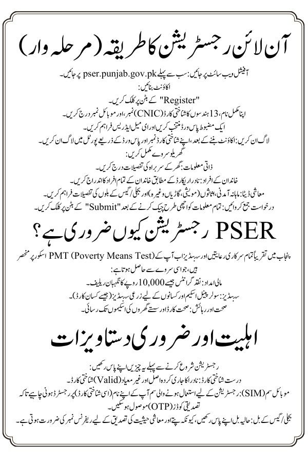 Registering in PSER is now mandatory for almost all Punjab-specific subsidies. Your eligibility is determined by a PMT (Poverty Means Test) score calculated from your survey data: