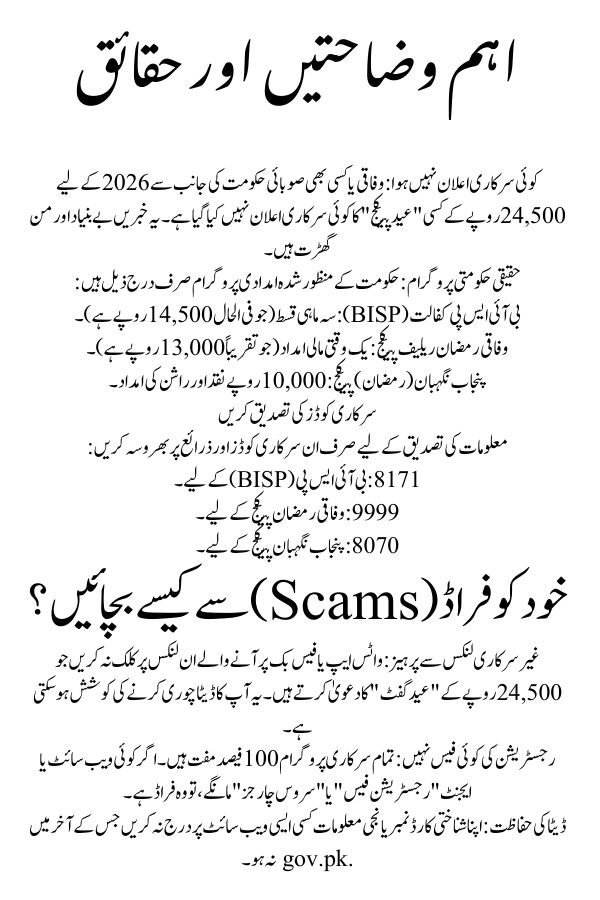 • No Official Announcement: Neither the federal government nor any provincial government has announced an “Eid Package” of Rs. 24,500 for 2026.